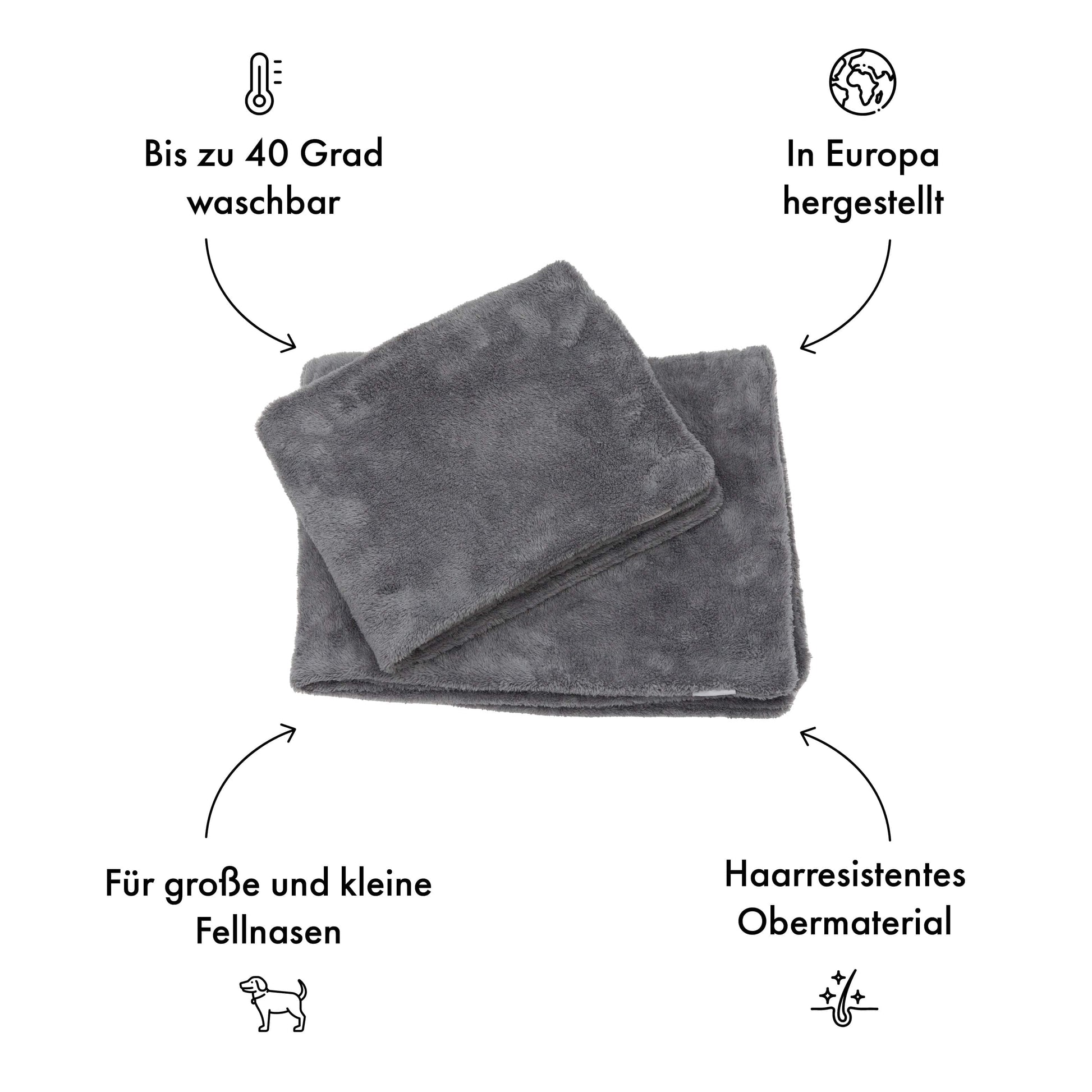 Extra pluizige hondendeken met twee lagen knus donkergrijs pluche voor behaaglijke momenten. Robuuste, vuilafstotende polyestervezels maken het duurzaam en gemakkelijk te onderhouden - gewoon machinewasbaar.